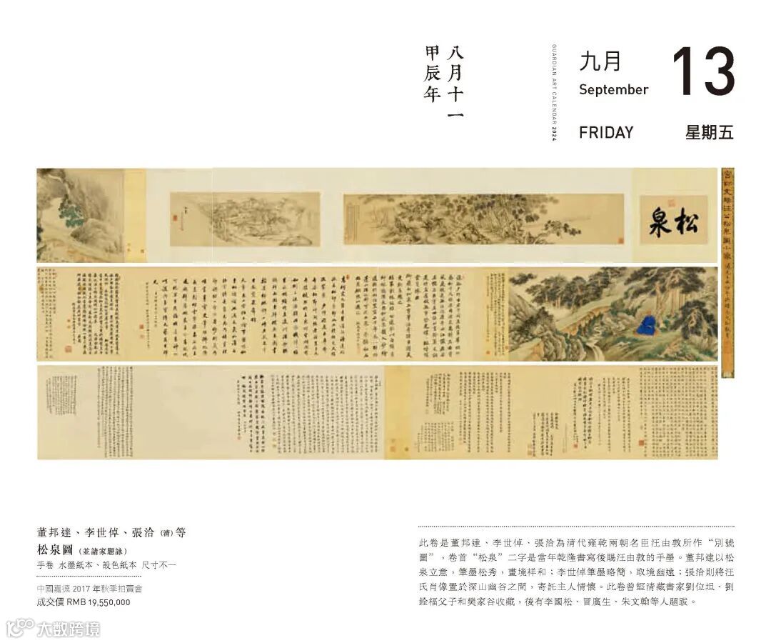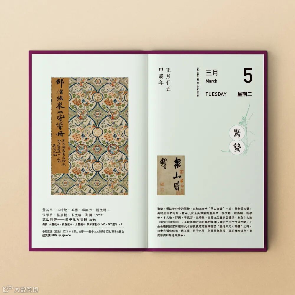《嘉德日曆2024》(繁體版)總計收錄366件作品,是對嘉德30年所徵集文物藝術品的精心集選,尤其甄選了「嘉德30周年慶典」2023年春拍的83件文物藝術珍品,這些躲過了戰火和災難的法書名畫、鐘鼎彝器,都是被人深藏的什襲之珍——譬如日曆收錄的2023年春拍的《畫中九友》集冊,為大藏家吳湖帆苦心尋覓15年才成,是已知公私收藏「畫中九友」的唯一套冊,可謂中國書畫收藏內容與形式之美的至高契合;收錄的天民樓藏瓷則是陶瓷收藏界翹楚葛士翹、葛師科父子兩代精心所藏明清御用瓷器,可謂隋侯之珠,風采絕世。