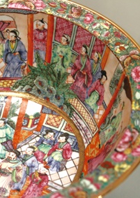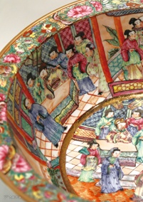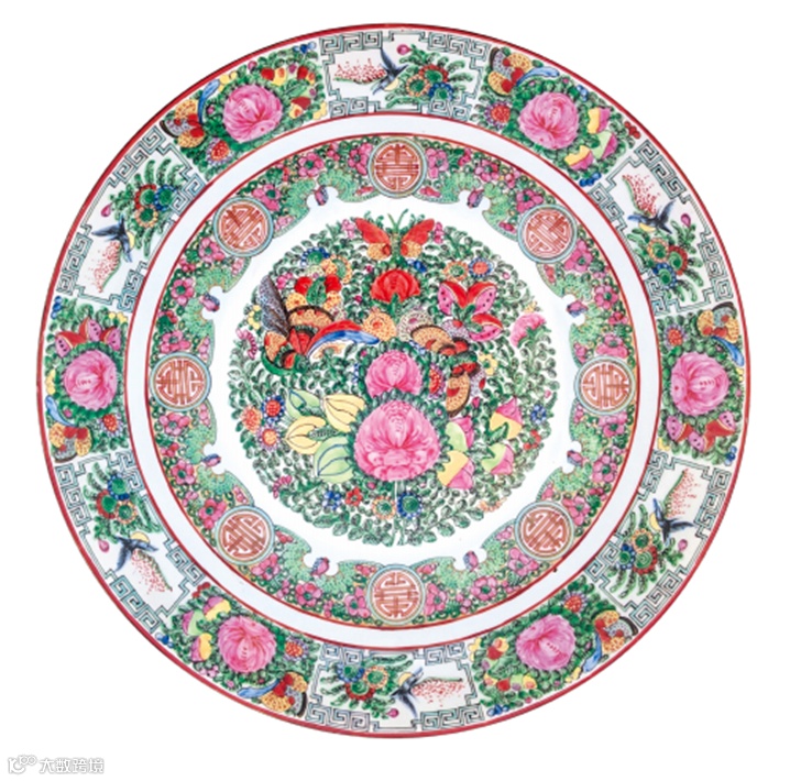 廣東彩瓷的格局講求對稱,但內容則不限,不可過密,也不可過疏。鋪排離不開由下而上的線性發展,表現出華麗婀娜和整齊有序。