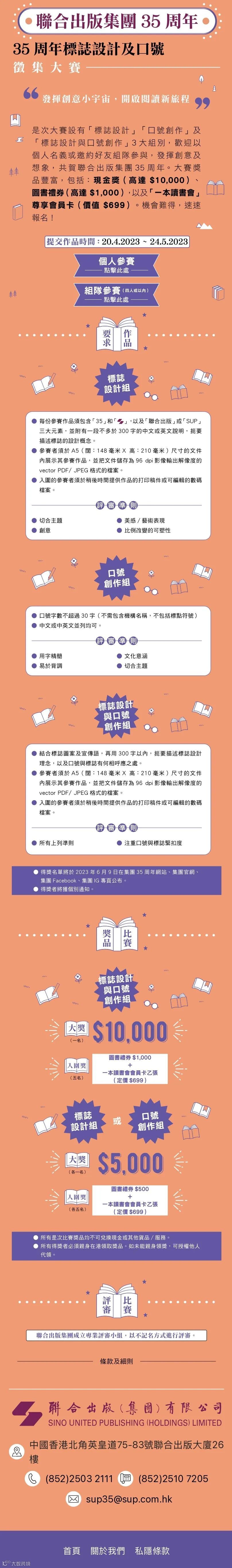 35周年兩項重點活動——35周年標誌及口號全民徵集大賽及「35年,35本最美的書」全民票選活動現正火熱進行中。其中標誌及口號徵集大賽分為「標誌設計」、「口號創作」以及「標誌設計與口號創作」3大組別,參賽者可以个人名義參賽,也可以組隊參賽。3大組別將各選出1名大奬及5名入圍奬,奬品十分豐厚: