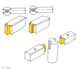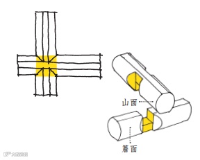刻半榫主要用於方形構件的十字搭交。按枋子本身寬度,在相交處,各在枋子的上、下面刻去薄厚的一半,刻掉上面一半的為「等口」,刻掉下面一半的為「蓋口」,等口、蓋口十字扣搭。應注意山面壓簷面,刻口外側要按枋寬的1/10做包掩。