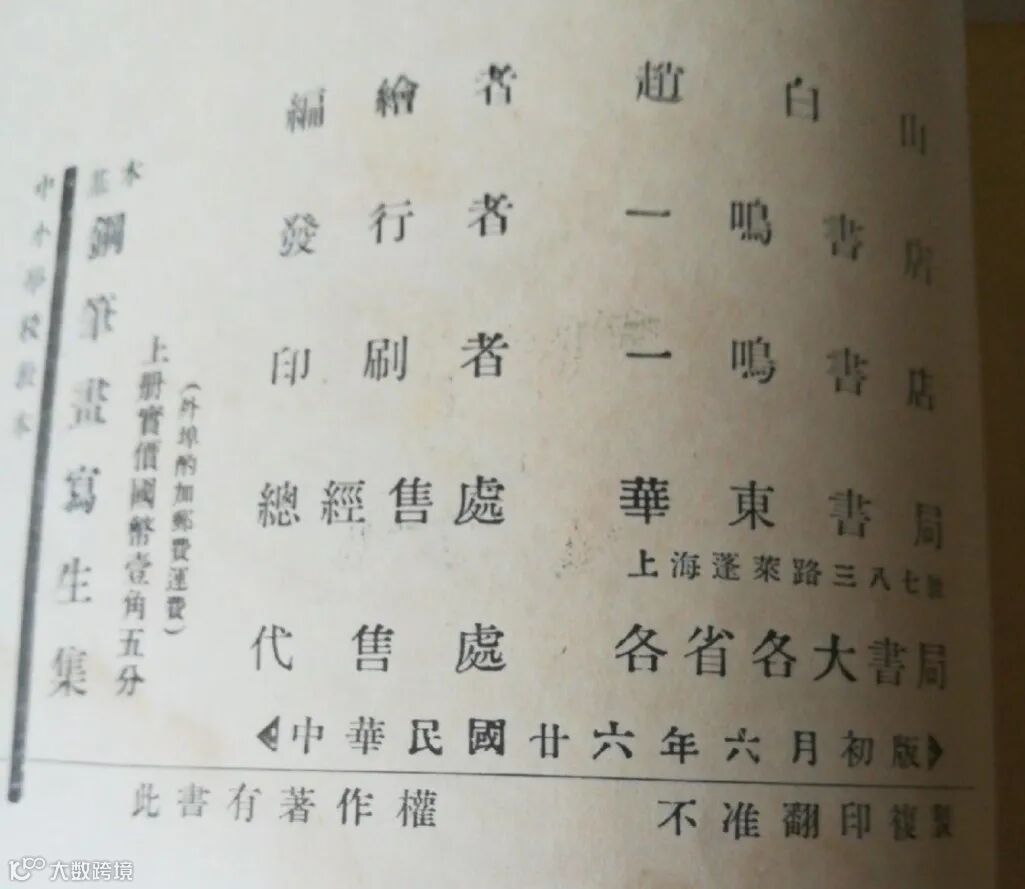 最早見到的出版物資料是1937年6月由上海一鳴書店出版的《中小學校教本——基本鋼筆畫寫生集》,作者趙白山,時年31歲。自此他在少兒美術出版這領域的工作就一直從沒間斷。