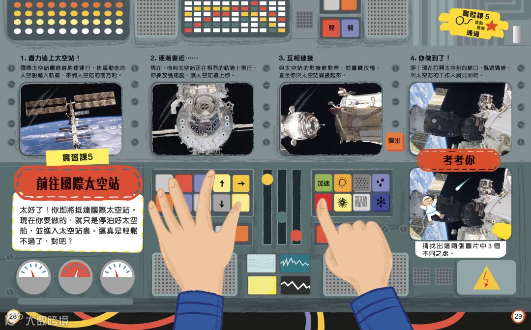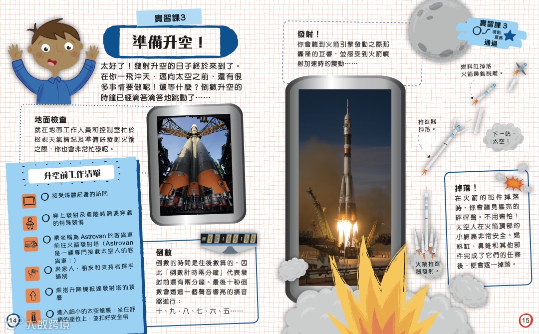 本書以活潑有趣的形式讓孩子體驗太空人的各種專業訓練,增加太空和航天知識;從火箭升空前的準備、到進行太空任務、到火箭回歸地球的過程,書中都有詳盡的解說。