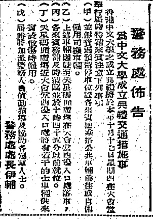 圖 | 《工商日報》1963年10月17日刊載了一則警務處佈告,載錄有關香港中文大學在香港大會堂成立典禮的交通措施安排。