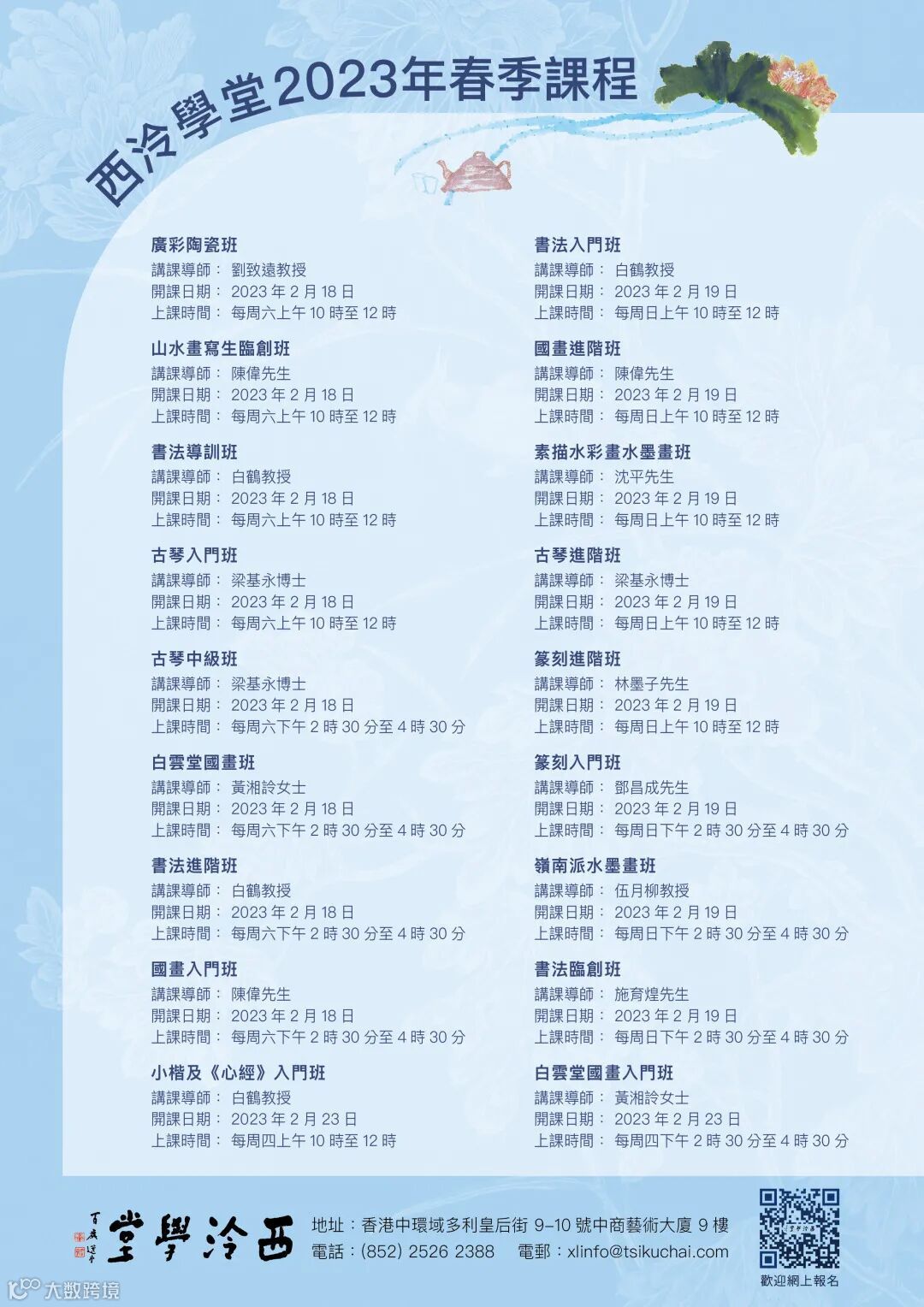 備註:請在報名費入數紙上注明「西泠學堂2023春季課程班別及姓名」並電郵至xlinfo@tsikuchai.com或傳真至2522 7953。 報名學費一旦交完,恕不退還,敬請諒解,非常感謝大家的支持和參與!