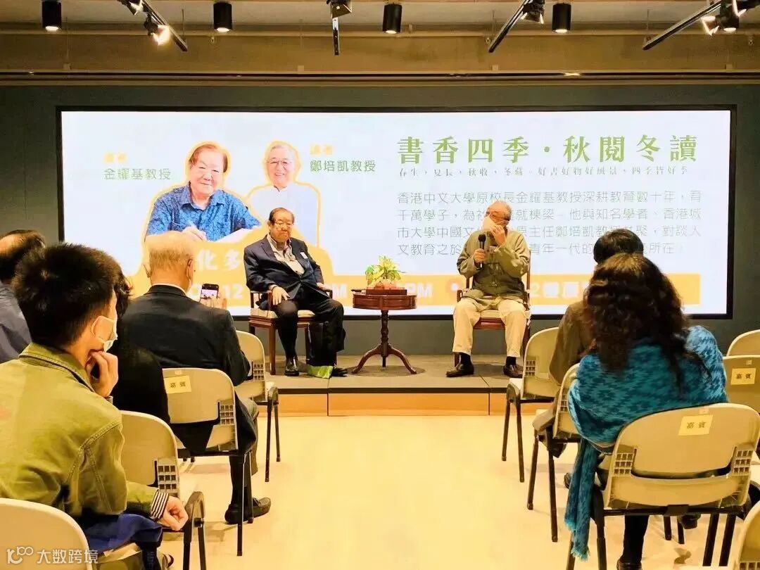 2022年11月12日在中環集古齋,香港中文大學原校長金耀基教授與香港城市大學中國文化中心原主任鄭培凱教授對談人文教育之於社會特別是青年一代的價值意義所在。
