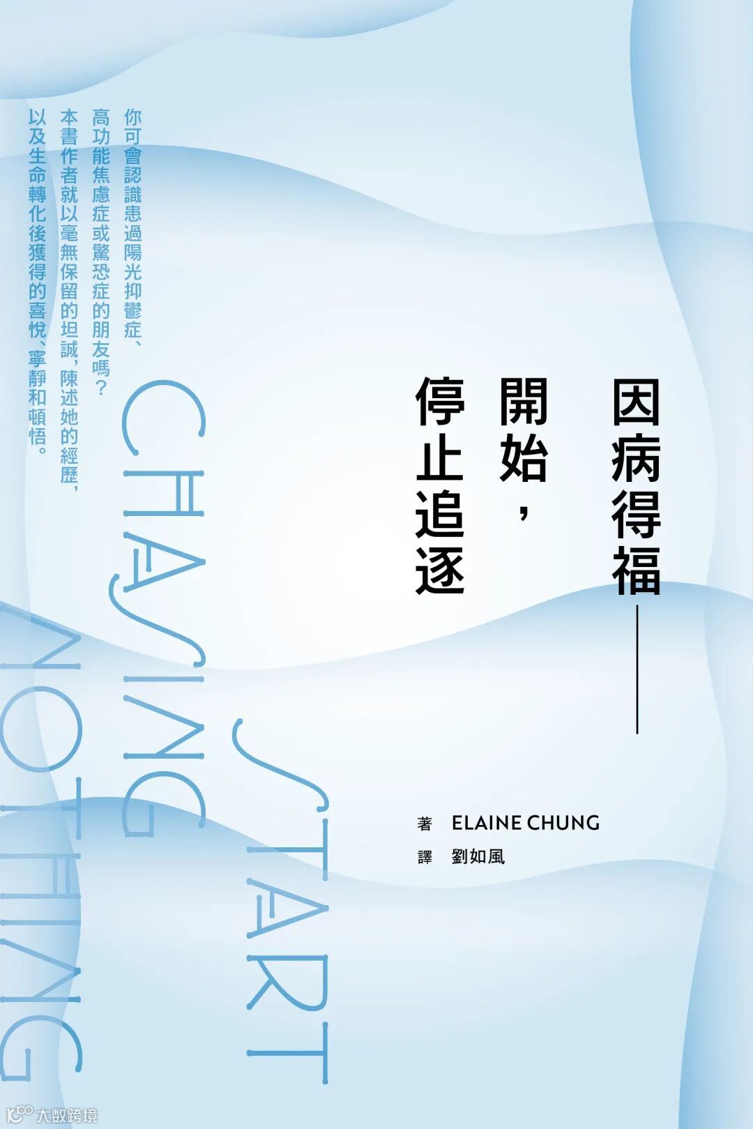 《因病得福——開始,停止追逐》的作者Elaine Chung就曾經出現以上的狀況。從加拿大回流的她既有卓越的學歷和豐富的履歷,亦擁有幸福的婚姻和家庭生活,然而驚恐和悲傷,卻會經常向她無故襲來!迫使她脫下強人戰衣,決心遠赴世界各地去跟隨靈性導師「尋真覓道」。回望患上癌症和驚恐症的經歷,Elaine才深深了悟,看似凶險和詛咒的患病經歷,原來正是上天帶領她走一趟「因病得福」的旅程!