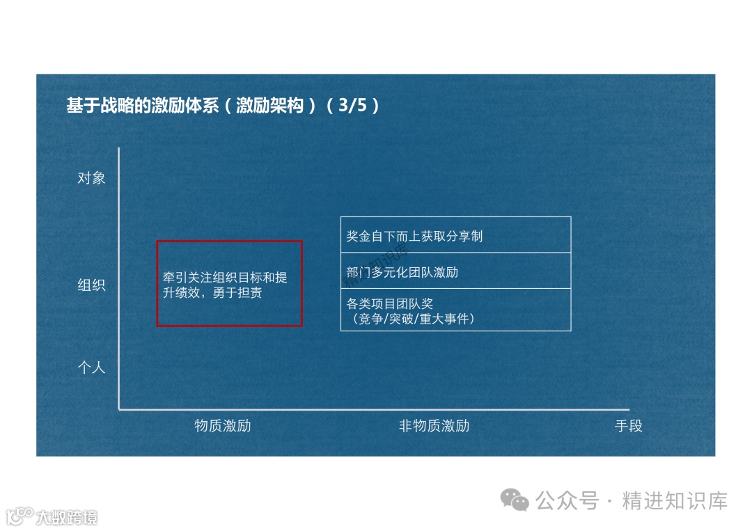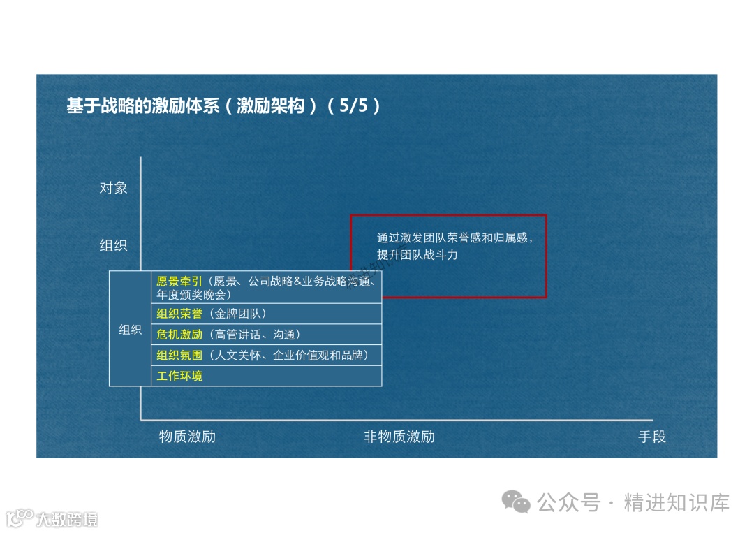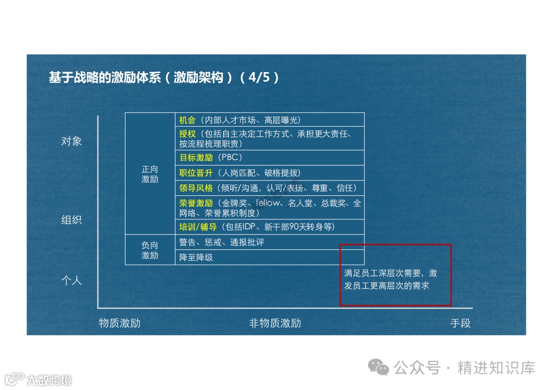 非物质激励手段包括提供内部人才市场机会、授权、目标激励(PBC)、职位晋升、领导风格的认可和表扬、荣誉激励(如金牌奖、fellow、名人堂等)、培训和辅导等。这些激励手段旨在满足员工的深层次需求,提升团队的战斗力和员工的个人成长。