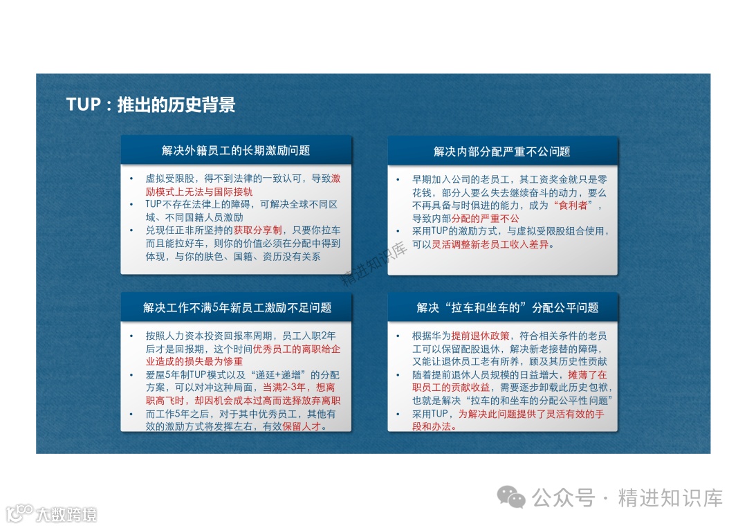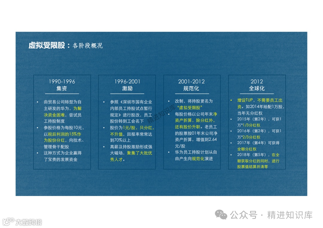 文章详细介绍了华为的虚拟受限股制度,这是一种内部员工持股计划,通过股份分红和股价升值来激励员工。虚拟受限股的管理执行机构是华为工会,所有人员持股均为虚拟受限股,不得私下转让和交易。此外,还介绍了TUP(Time-based Unit Plan)作为虚拟受限股的补充,旨在解决外籍员工的长期激励问题,以及新员工激励不足和内部分配不公等问题。