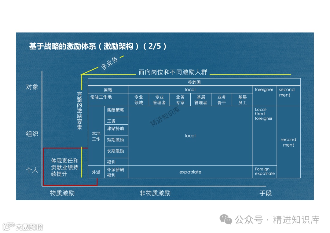 华为的物质激励策略包括工资、津贴补助、短期激励、长期激励和福利等。这些激励措施针对不同对象,如本地员工、外派员工、管理者、业务专家等,以及他们的常驻工作地、国籍等,形成了面向岗位和不同激励人群的完整激励要素。