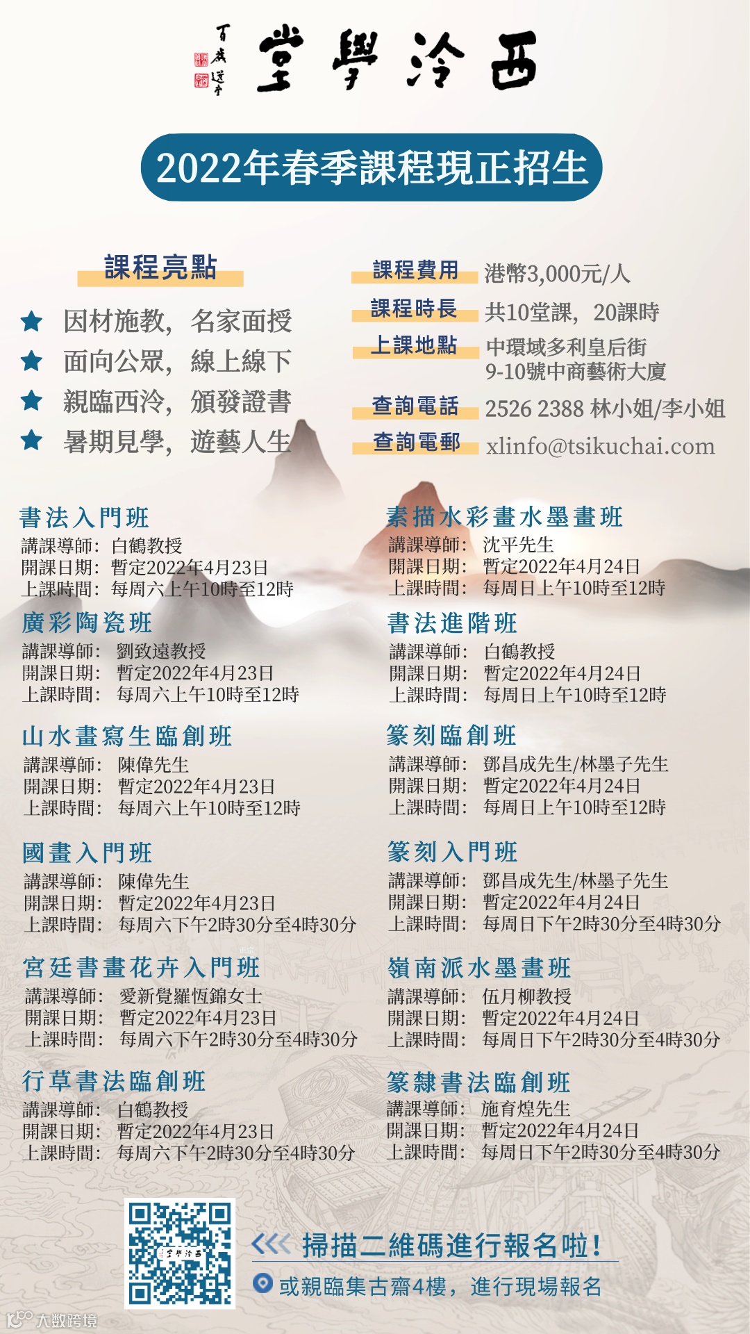 備註:請在報名費入數紙上注明「西泠學堂2022春季課程報名學員(姓名)」並電郵至xlinfo@tsikuchai.com或傳真至2522 7953。報名學費一旦交完,恕不退還,敬請諒解,非常感謝大家的支持和參與!