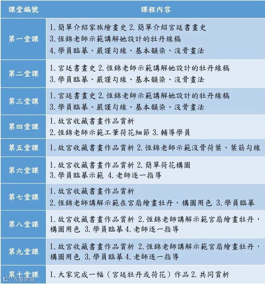 培訓内容:恆錦老師會用家族教授的方法,輔導學員由臨摹到簡單創作,工筆的勾線,沒骨畫法,基本功暈染,小寫意用色,生動有趣體現在畫作中。通過賞析導讀故宮收藏書畫,理解宮廷書畫之嚴謹之美,了解宮廷書畫歷史由來。由了解,練習到熟練掌握工筆、小寫意技法,簡單花卉構圖(牡丹/荷花等)。