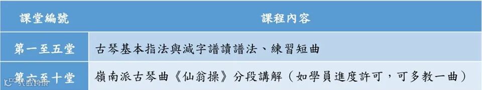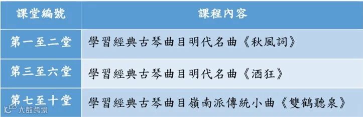 培訓内容:本課程適合已完成古琴入門課程的學生,将以十堂課爲階段,學習經典古琴曲目明代名曲《秋風詞》與《酒狂》,以及一首嶺南派傳統小曲《雙鶴聽泉》,掌握後可達至自娱與表演之樂趣,讓學員理解古琴音樂的審美旨趣,弘揚中華傳統文化。