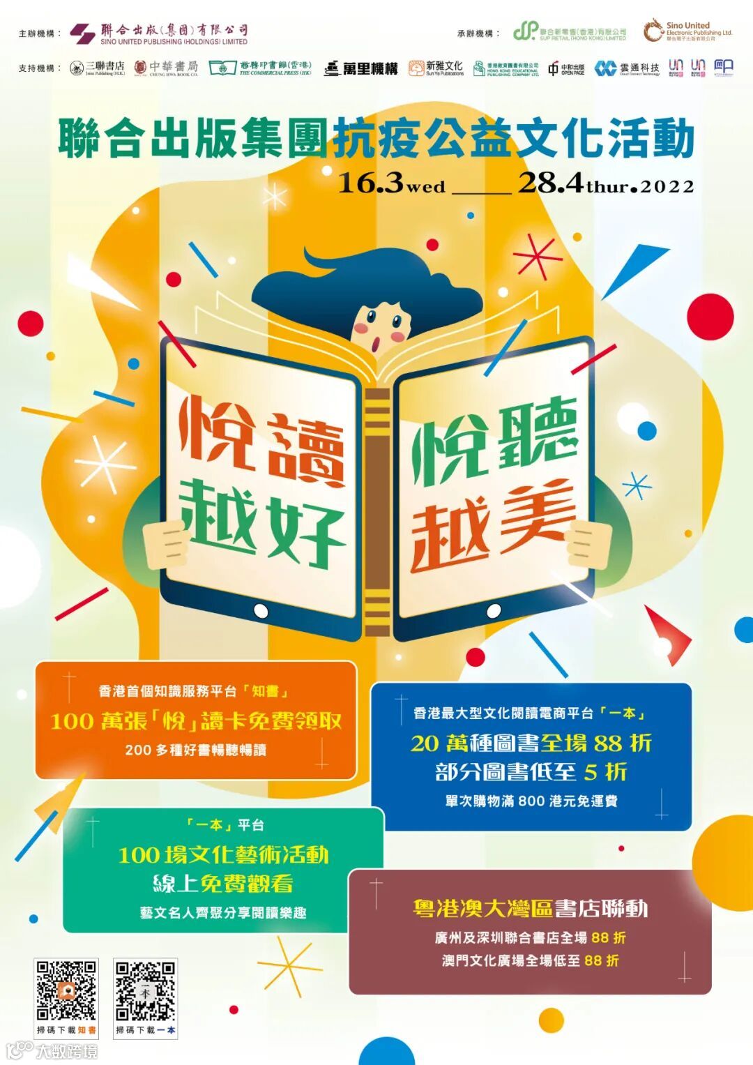 是次活動是聯合出版集團「世界閱讀日」系列推廣活動之一,由3月16日延續至4月28日,主要包含兩部分內容:一是香港首個知識服務平台「知書」面向全港市民派送100萬張免費「悅」讀卡,暢讀暢聽200多種精品電子書、有聲書及名家課程;二是香港最大型文化閱讀電商平台「一本」全場20萬種精品圖書88折優惠(部分圖書低至5折)及100場藝文節目線上免費觀看,鼓勵市民安坐家中,同享閱讀樂趣,齊聚正能量。