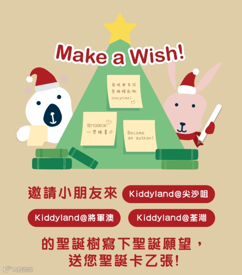 歡迎小讀者們來到尖沙咀、將軍澳和荃灣的Kiddyland,只要於指定門市購買兒童圖書折實滿150港元,在聖誕樹下寫上聖誕願望,即送聖誕卡乙張!