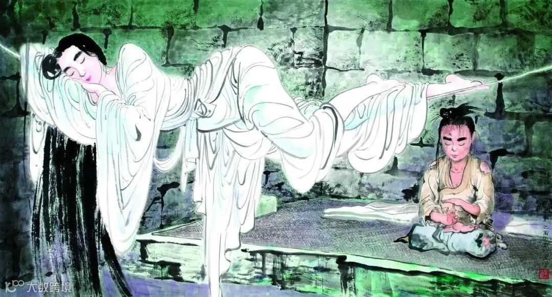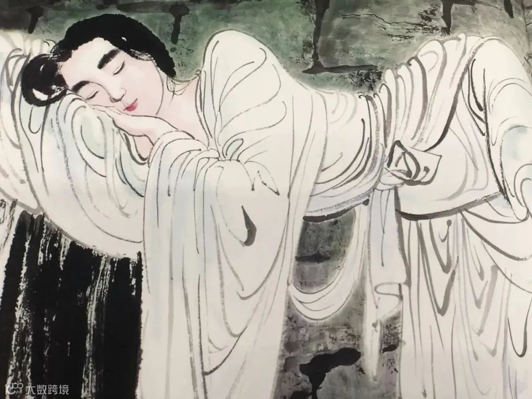 「這幅畫體現了中國國畫的精髓,妙在『似與不似之間』,達到了『不似之似』。我們誰都沒見過小龍女長什麼模樣,中國畫也並非強調形似,而是重在神似。小龍女睡於一根細繩之上,舉重若輕,再看小龍女體態,全身宛若無骨,睡姿悠閒。整幅畫面全部冷色,偏偏朱唇一點紅!一點暖色就讓畫面溫馨起來。而且畫面中間部分明亮,四周陰暗,仿佛床前真的有一盞油燈在照耀。這是糅合了西洋畫的光影透視法。觀之印象強烈,突出人物性格,正是中國畫不求形似但求神似的特點。整個背景『密不透風』,與中國畫通常『疏可走馬』相映成趣。」