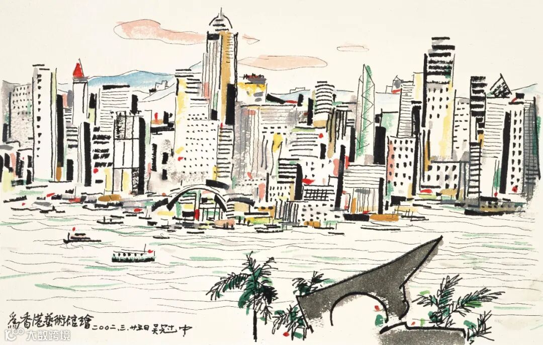 圖 | 2002年3月,吳冠中在香港藝術館平台上,示範寫生維多利亞海港。