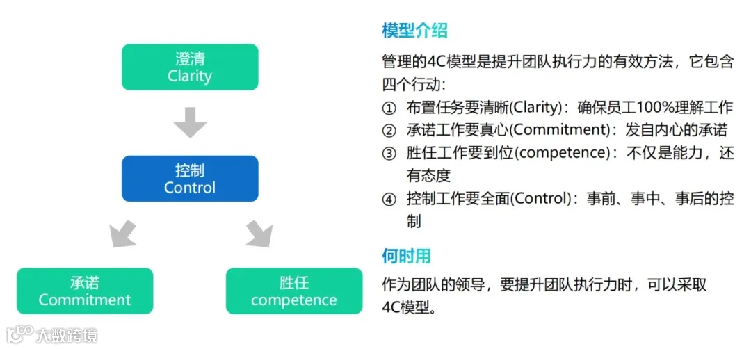 管理4C模型包括:确保任务布置清晰(Clarity)、激发员工真心承诺(Commitment)、提升团队胜任能力(Competence)以及全面控制工作过程(Control),这四个方面共同构成了有效管理的基础。