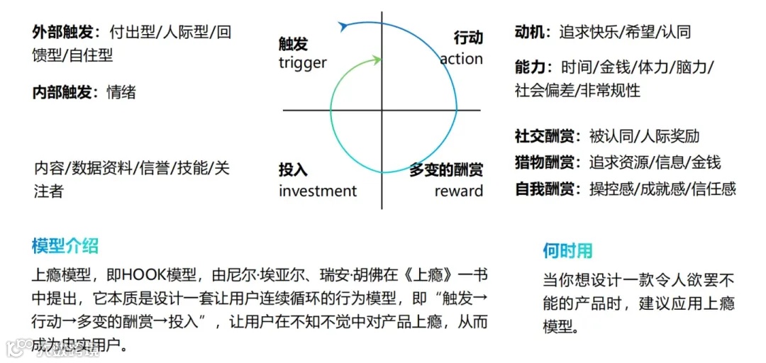 上瘾(HOOK)模型是一种产品设计和用户行为模型,旨在通过触发、行动、奖励、投入四个循环阶段,培养用户的使用习惯,使用户对产品或服务形成依赖并持续使用。越投入,越上瘾。
