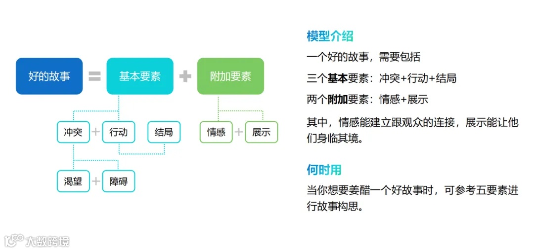 一个好的故事,需要有冲突、行动、结局、情感、展示5个要素。