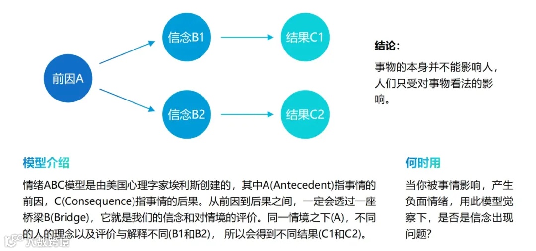 情绪ABC模型认为,激发事件A只是引发情绪和行为后果C的间接原因,而个体对激发事件A的认知和评价而产生的信念B才是引起C的直接原因。即人的情绪和行为结果C并非直接由事件A引发,而是由个体对事件A的信念B所决定。