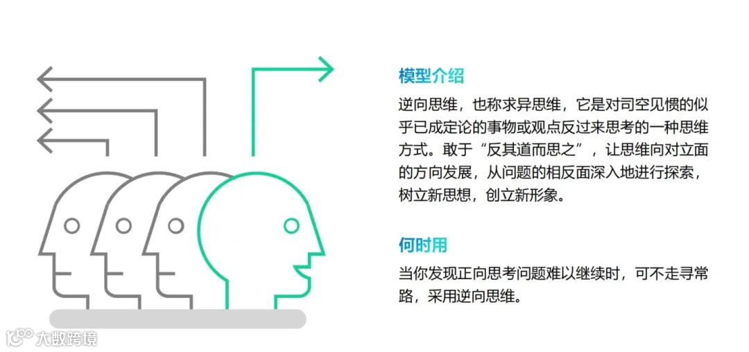 逆向思维,也称求异思维,是一种反过来思考问题的思维方式,即敢于“反其道而思之”,让思维向对立面的方向发展,从问题的相反面深入探索,从而可能获得新的灵感和创意,帮助人们跳出固有模式,打破思维定势。