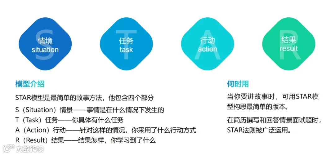 STAR模型指的是描述一个完整故事的框架,包括情境(Situation)、任务(Task)、行动(Action)和结果(Result)四个部分,帮助清晰、有条理地叙述个人经历或成就。