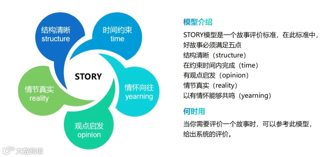 STORY模型是一个评估和构建故事的框架,它要求故事具备结构清晰(Structure)、在约束时间内完成(Time)、有观点启发(Opinion)、情节真实(Reality)以及能引发情怀共鸣(Yearning)的要素。