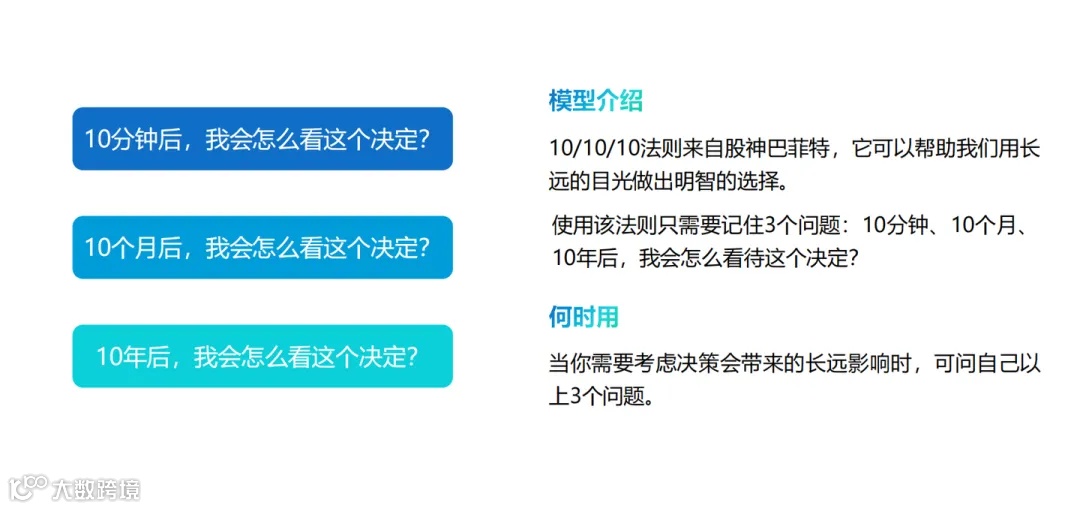 10/10/10法则是一种决策工具,它要求决策者在做选择时,分别从10分钟、10个月、10年后的视角来评估决策的可能影响,以帮助决策者更全面地考虑问题,减少冲动决策的风险,并做出更明智的决策。