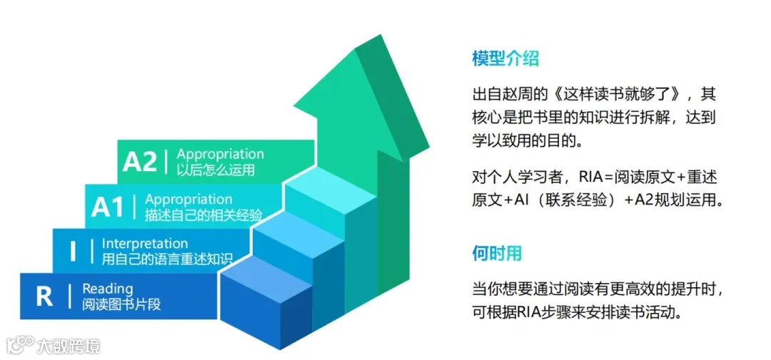 RIA阅读法包含阅读(R)、理解(I)、应用(A)三个环节,旨在通过阅读启发片段、理解知识点并思考如何应用于实际,以提升阅读效果和个人能力。