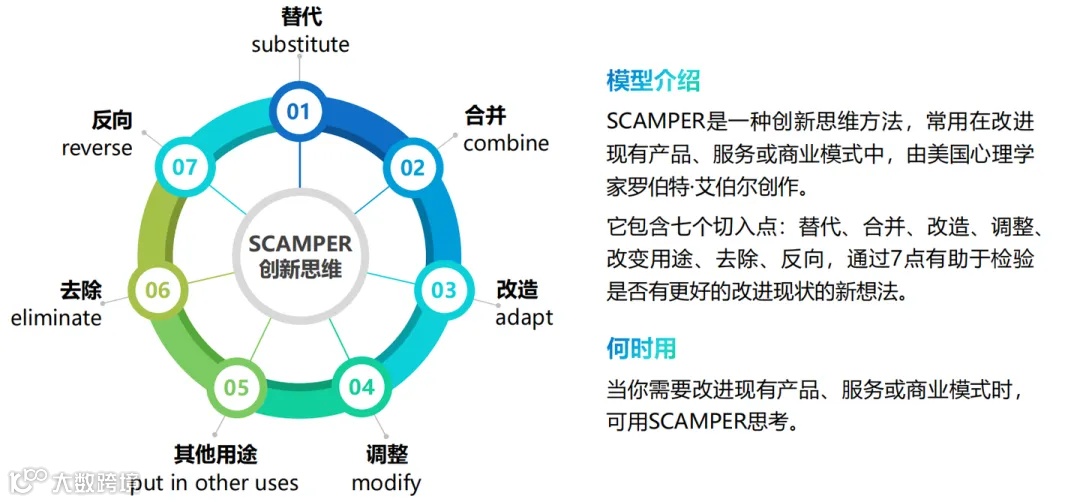 SCAMPER创新思维是一种通过替换、整合、改造、修改、增加、去除和逆向操作等方式,来激发思维活力,打破常规,达到创新目的的方法。