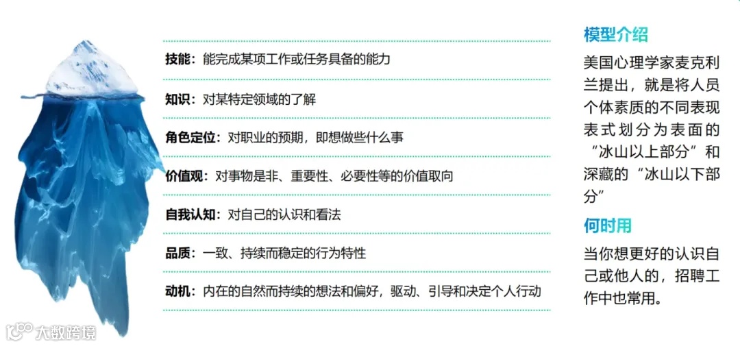 冰山模型是一个人才管理工具,由美国心理学家戴维·麦克里兰提出,它将个体素质划分为表面的“冰山以上部分”(包括知识和技能)和深藏的“冰山以下部分”(包括社会角色、自我形象、特质和动机),用于全面评估和提升人才的胜任素质。
