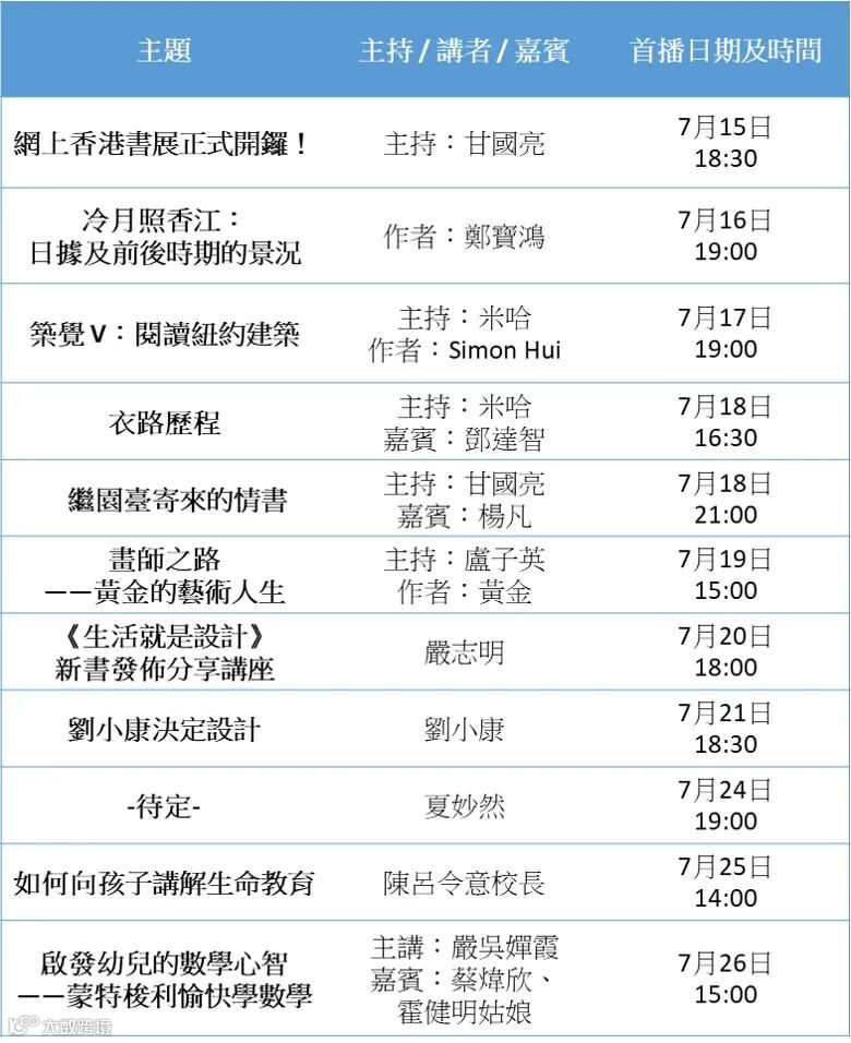 「一本」於7月15日至26日的香港書展直播活動詳情,期間或有新增活動,請關注「一本」網站 。