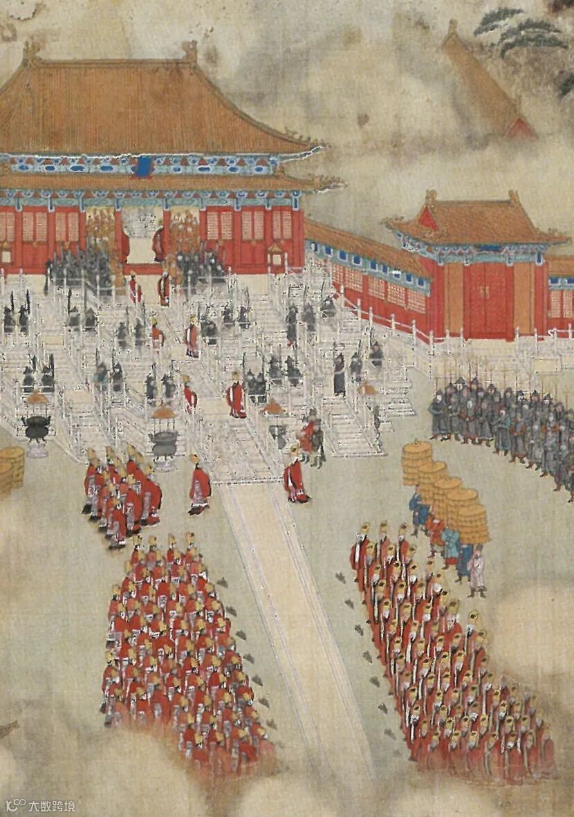 身穿祭服的明代百官侍奉於皇極殿(今太和殿)外。| 圖:《故宮博物院文物珍藏全集:明清肖像畫》之《徐顯卿宦跡圖冊》