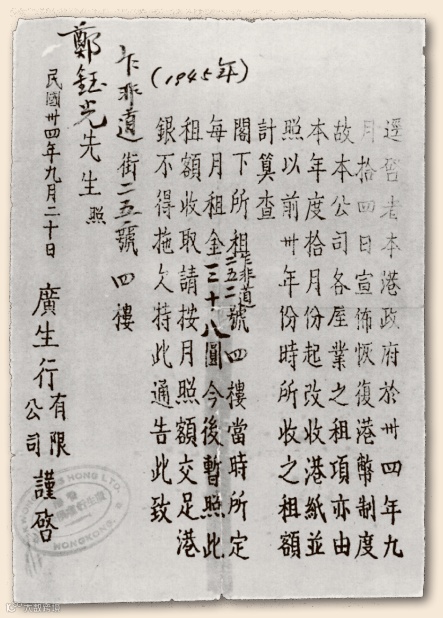 圖 | 1945年9月20日,廣生行向租戶發出的通告,宣佈租項改收港幣。