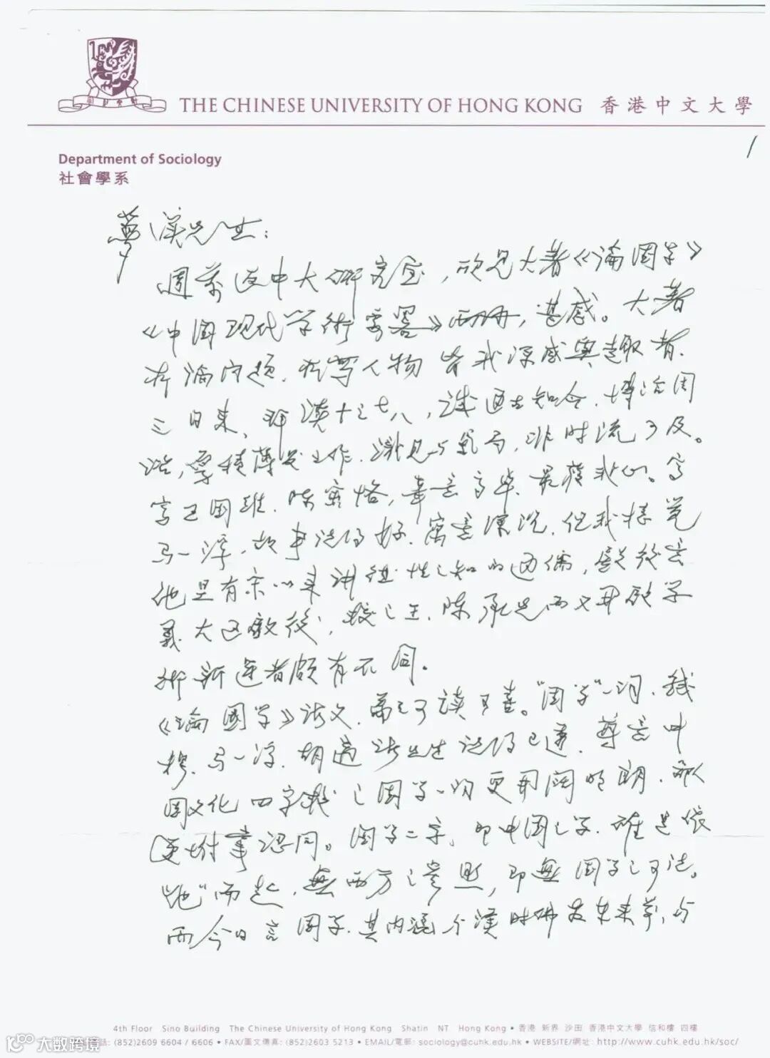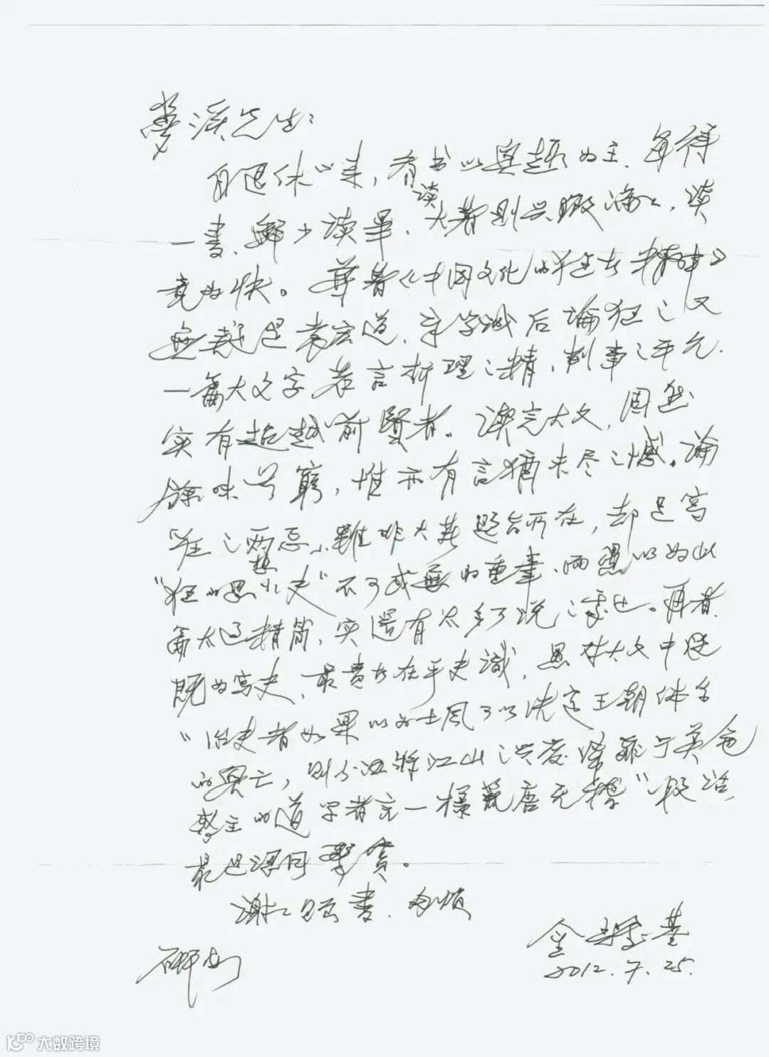 我和金先生的通信很多,常常寄一本新出的《中國文化》,他也會來信致謝。如果寄書,他更是讀之評之,並就書中的議題與我討論。2012年我寄拙著《中國文化的狂者精神》給他,不久就接到來示。原信不長,茲抄錄出來與讀者一起分享。