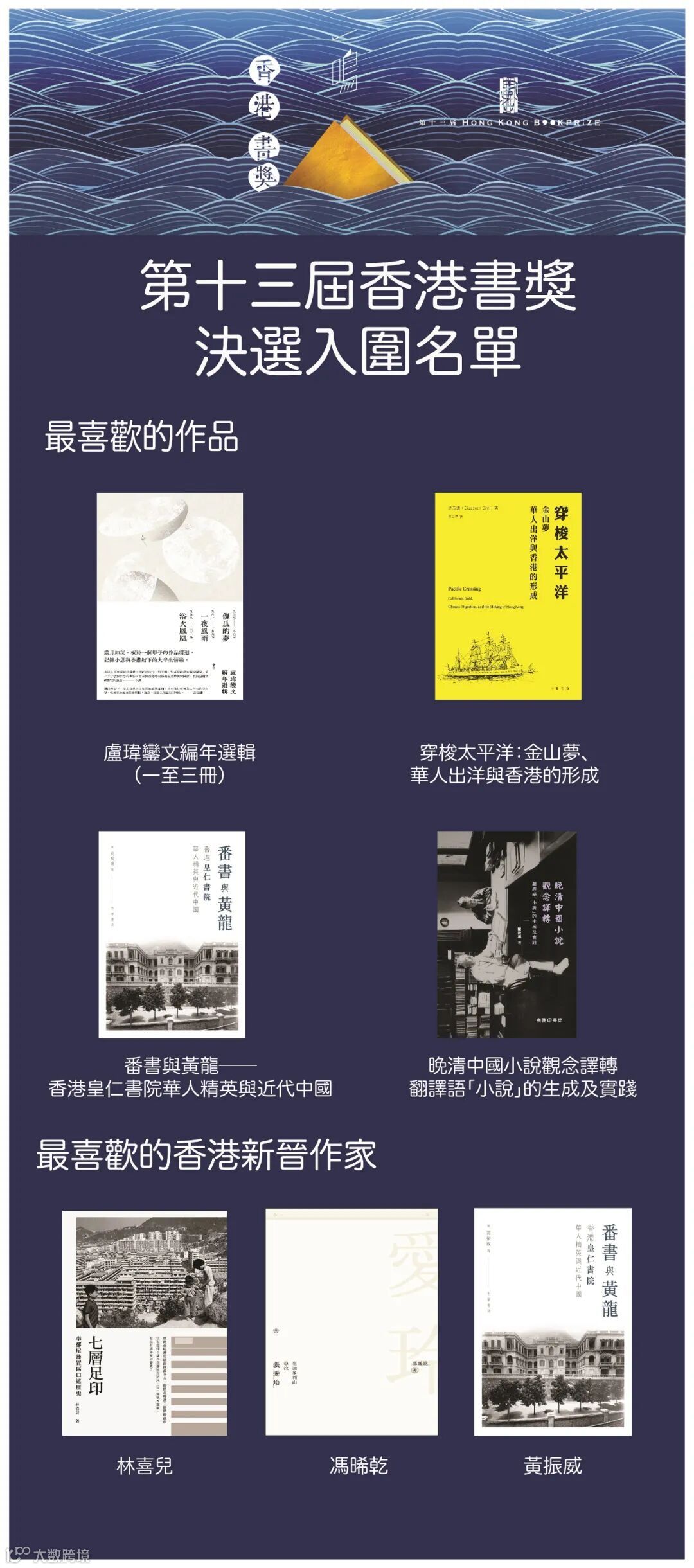 今年香港三聯書店、香港中華書局、香港商務印書館共有4本圖書入圍「最喜歡的作品」決選名單,3位作家入圍「最喜歡的香港新晉作家」決選名單。