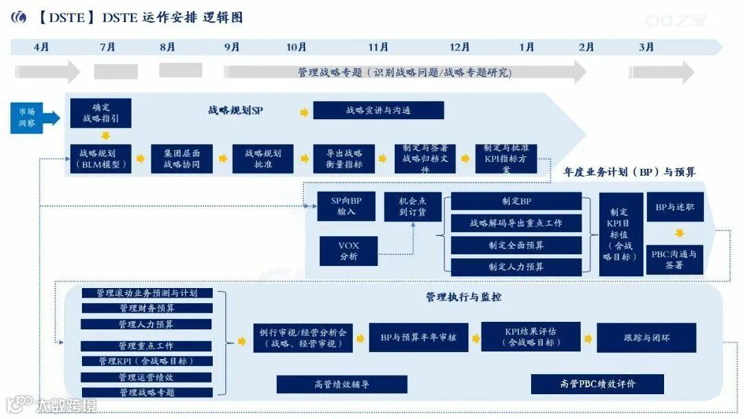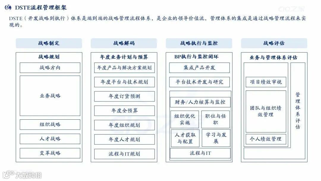 DSTE(从战略到执行):端到端战略管理框架,确保中长期战略与年度计划一致,核心包含两大子流程: