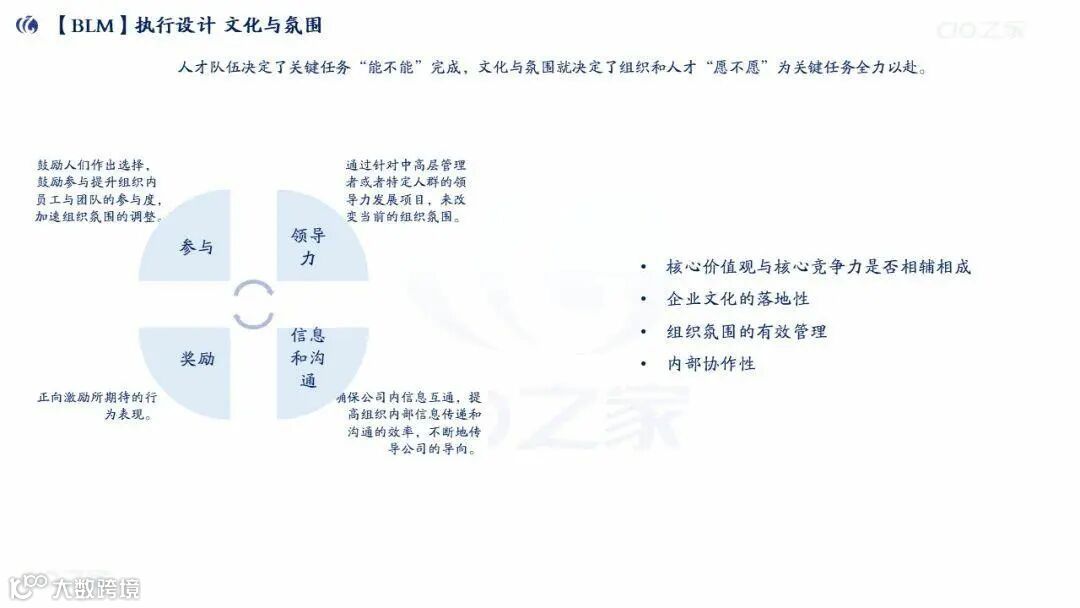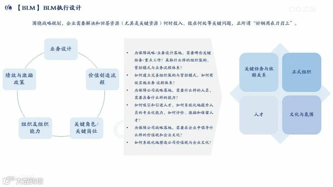 执行设计:落地关键任务,匹配正式组织、人才(关键岗位能力)、文化氛围(激励参与/信息互通)。