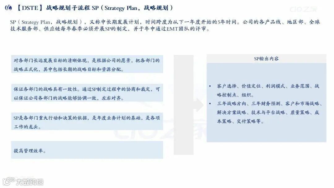 SP(战略规划):5年中长期计划,每年春季制定、年中EMT评审,输出客户选择、3年战略方向、财务预测等,作用是统一部门战略、支撑年度计划。