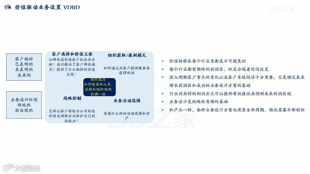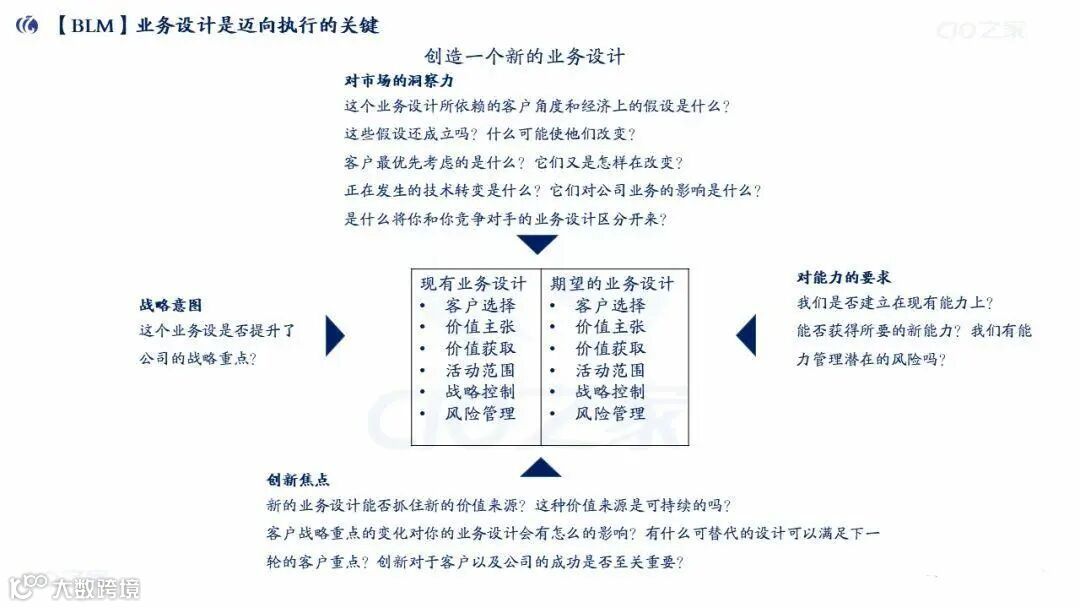 战略设计:从“业绩差距(现有vs期望)”“机会差距(现有vs新业务设计)”出发,通过“市场洞察(五看:看趋势/市场/客户/竞争/自己)”“业务设计(客户选择/价值主张/利润模式等6要素)”制定战略。