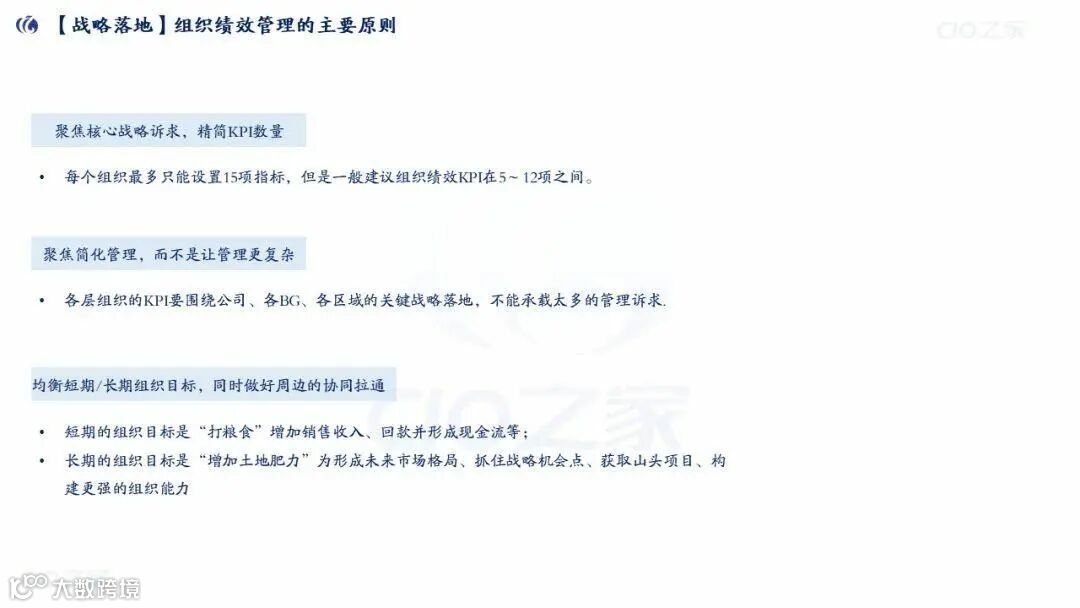 KPI设计原则:聚焦核心战略,数量5-12项(最多不超过15项),均衡短期(打粮食)与长期(增肥力)目标;