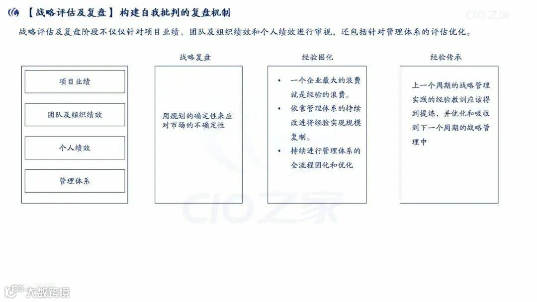 复盘机制:审视项目业绩、组织/个人绩效、管理体系,提炼经验并固化到下一轮战略; -