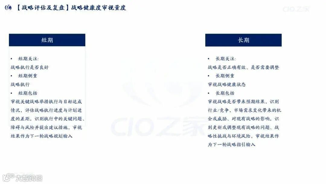 战略健康度审视:短期看“战略执行进度”,长期看“战略有效性(行业/市场变化影响)”。