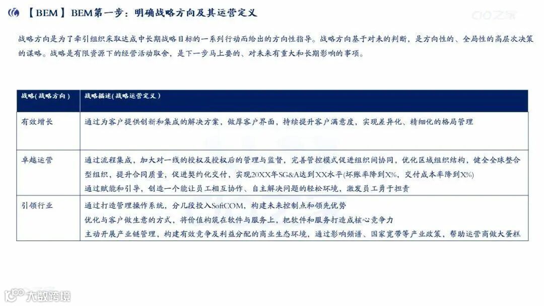 明确战略方向及运营定义(如“有效增长”定义为“差异化格局管理”);