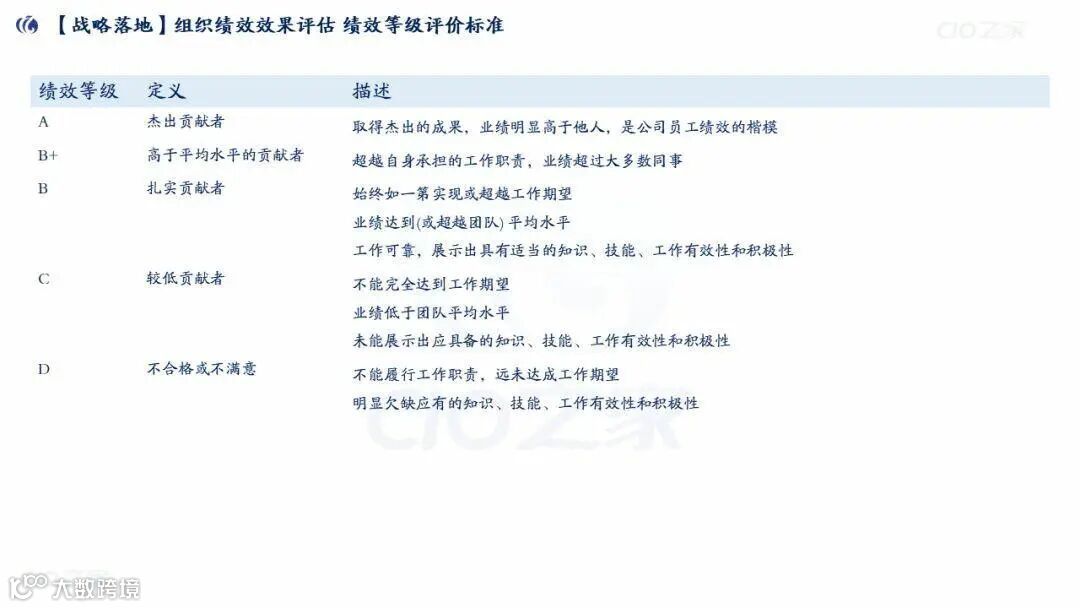 绩效等级:A(杰出)、B+(高于平均)、B(扎实)、C(较低)、D(不合格)。