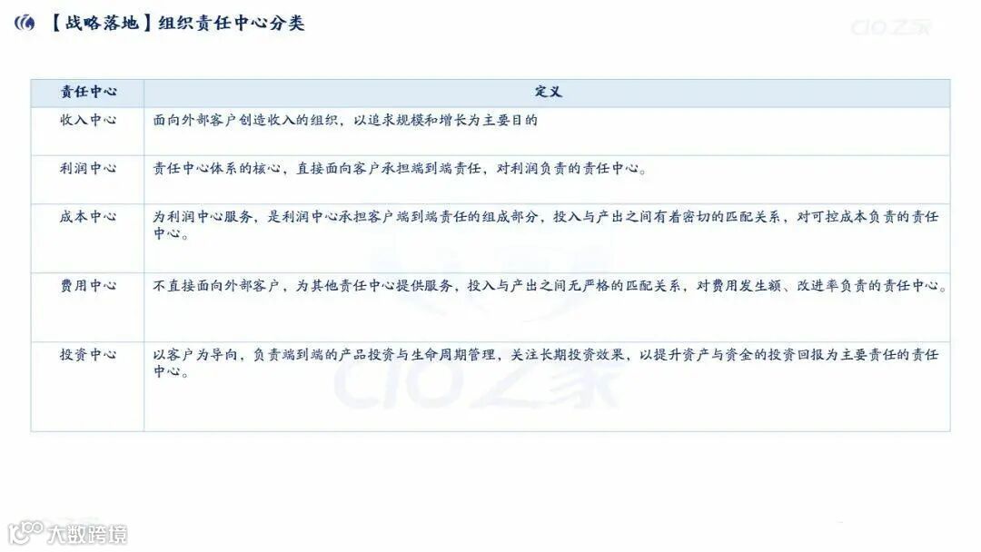 责任中心分类:收入中心(创收入)、利润中心(对利润负责)、成本中心(控成本)、费用中心(控费用)、投资中心(管长期投资回报);