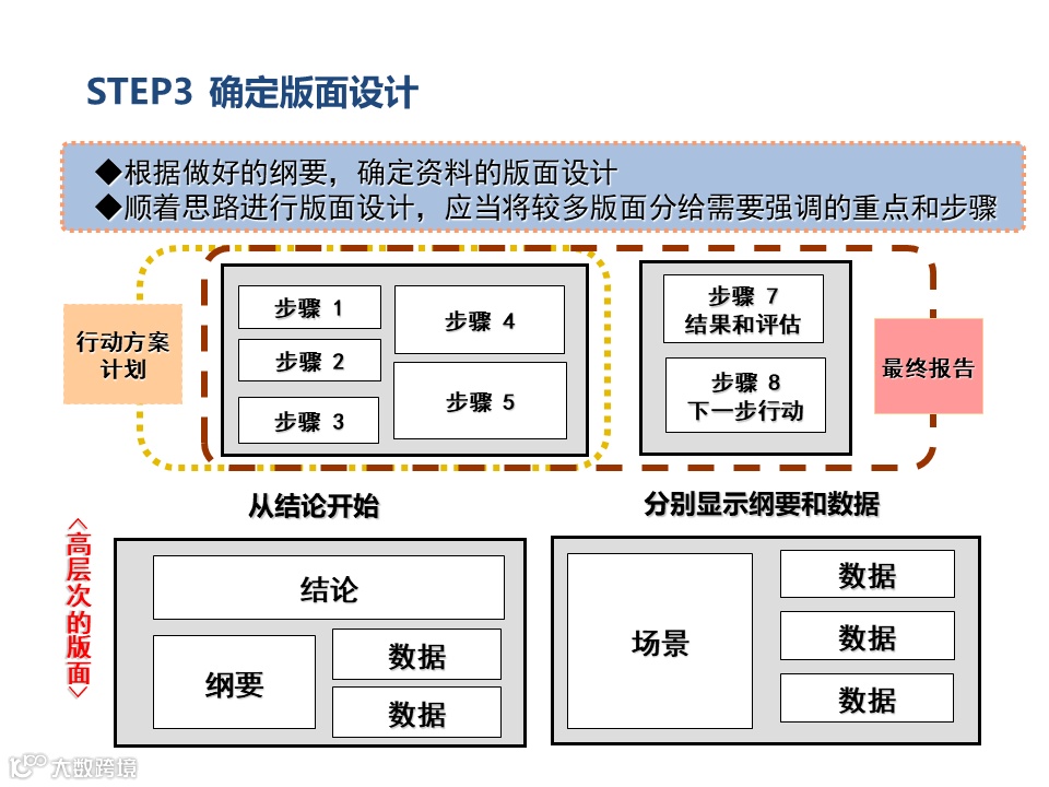 根据纲要分配版面,重点模块(如现状、根源)占比更大;常见设计模式:“纲要+数据”分离、“结论先行”(先结果再原因)。