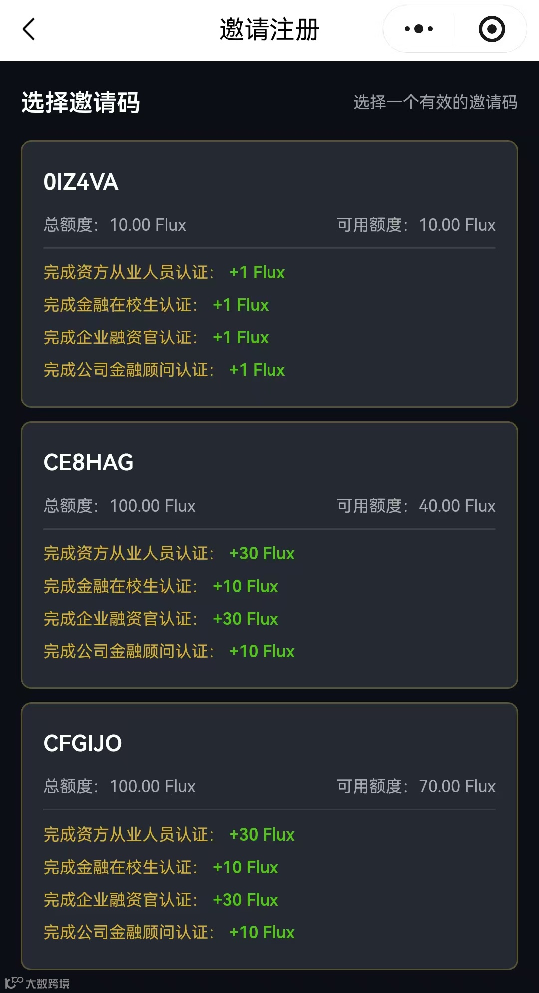 状态清晰:在「我的邀请码」列表中可以随时查看每个邀请码的总额度、已用额度、剩余额度及使用状态。 -