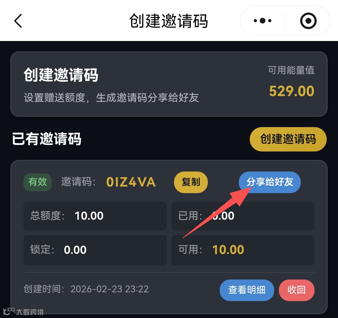 想将优质服务推荐给好友,并与他一同收获奖励吗?全新上线的 「邀请码」 功能,让这一切变得轻松而有趣。您可以根据心意自由设置额度,好友认证后即可获取对应能量值,实现真正的共享双赢。