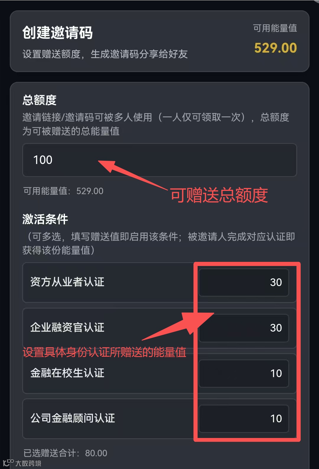 1. 在创建页面,首先设置该邀请码的“可赠送总额度”(例如100或500能量值)。这是您为此码预设的能量总值。